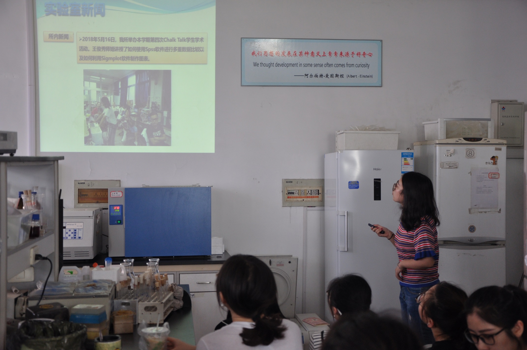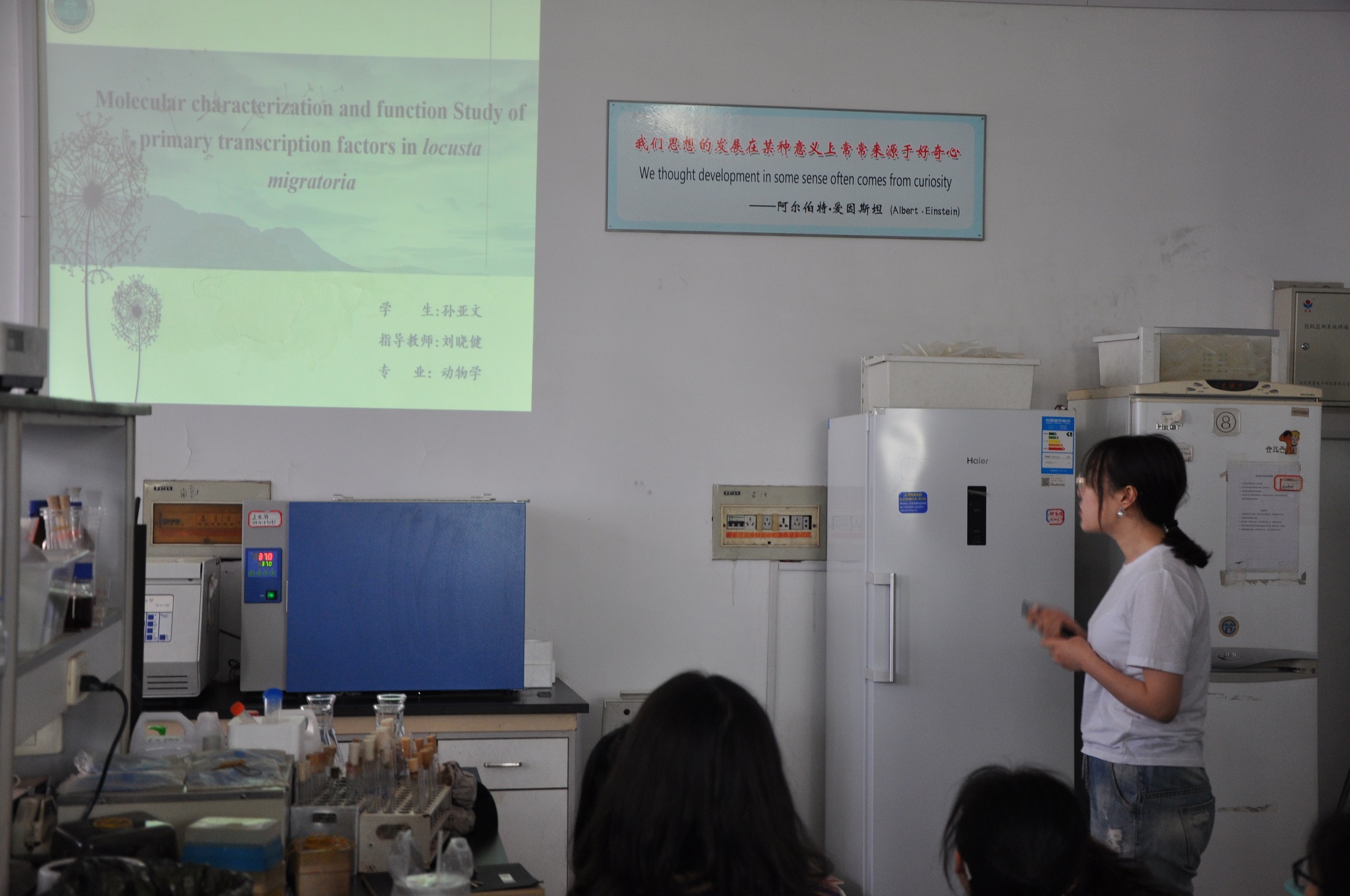 首先,马付露同学介绍了近期实验室内的重要新闻:2018年5月16日,我所成功举办第四次chalk talk研究生学术活动,王俊秀同学讲授了如何使用Spss软件进行多重数据比较以及如何利用Sigmplot软件制作图表;2018年5月17日,我所马恩波、李涛、张婷婷、董玮等老师和刘娇、张睿、王俊秀等研究生参加由我校化学化工学院举办的学术报告,报告人为华中师范大学杨光富教授,报告题目是“绿色农药的分子设计及新品种创制”,扩大与相关学科学者的交流,促进科研工作进展;2018年5月18日上午,我所在理科楼113教室召开2014级本科生毕业论文答辩会;2018年5月28日,我所在生命科学学院三层会议室召开2018届动物学、细胞生物学专业研究生学位论文答辩会,全所师生参加会议。此外,马付露同学还介绍了近期国内外本领域最新科研进展和发表于国际学术刊物、与本研究所研究内容相关的重要学术论文。