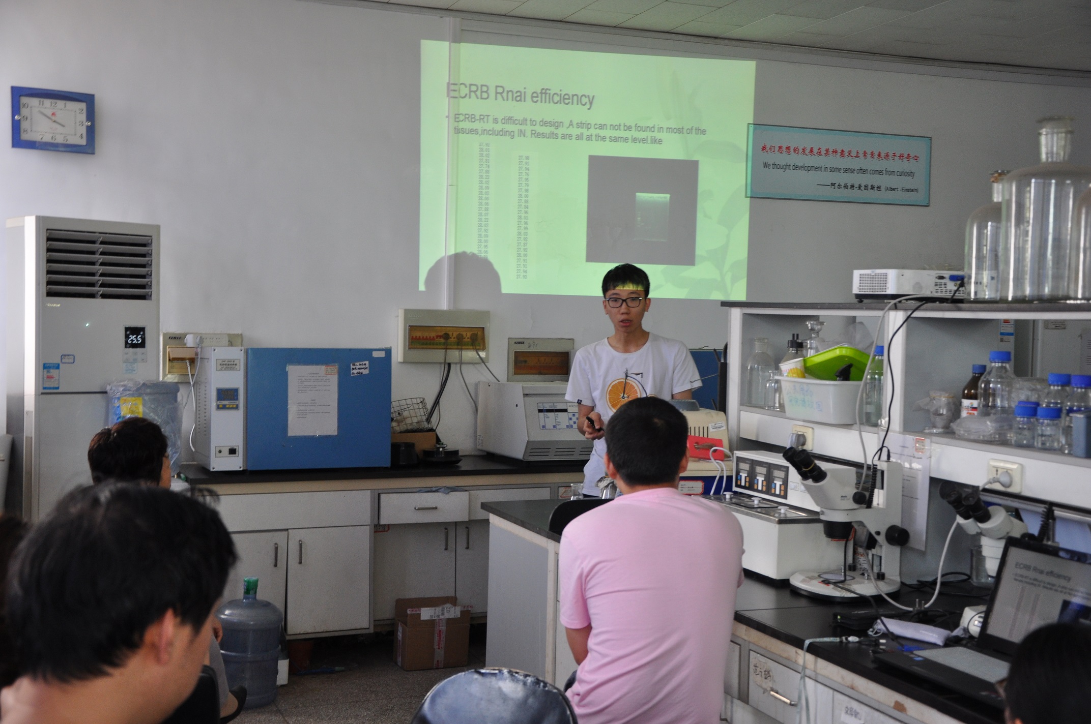 之后,孙亚文和张政同学分别围绕“飞蝗初级转录因子的分子特征和功能研究”和“飞蝗蜕皮激素受体ECR和RXR基因的分子特征及功能研究”的研究背景、实验进展和本学期的工作计划进行了汇报。在座师生对两位同学的报告进行了点评,并提出具体建议,对其下一步的研究工作具有重要的指导意义,也对低年级的同学起到了引导作用。