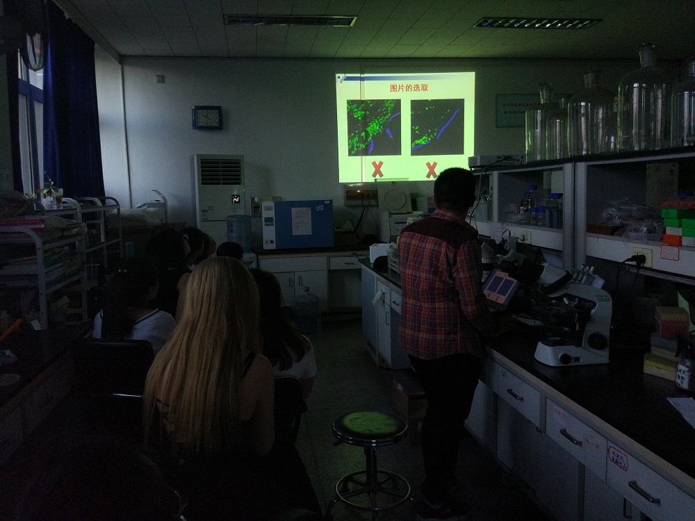 柳伟伟同学经过前期充分的准备,从免疫组化原理、免疫组化步骤和实验注意事项等几方面展开讲述,清晰地展示了免疫组化技术的基础知识和操作方法,使同学们从免疫组化的基本原理、操作流程到图片的整理等方面全面掌握了该项研究技术。在演讲中,柳伟伟同学还介绍了很多免疫组化实验工作的技巧,如抗原修复时要掌握好柠檬酸缓冲液的温度和时间,使用蛋白酶K进行抗原修复等。这些关键技术都是柳伟伟同学在读研究生期间科研工作的亲身体会和经验,具有很强的操作性,通过讲述,为同学们今后开展相关实验工作提供了有益的借鉴。柳伟伟同学的讲解条理清晰,表述生动,同学们收获颇丰。在互动交流过程中,同学们提出很多自己实验中遇到的问题,柳伟伟同学针对性地进行分析,解决同学们的困惑,同学们之间也进行了经验交流,互动交流气氛活跃。